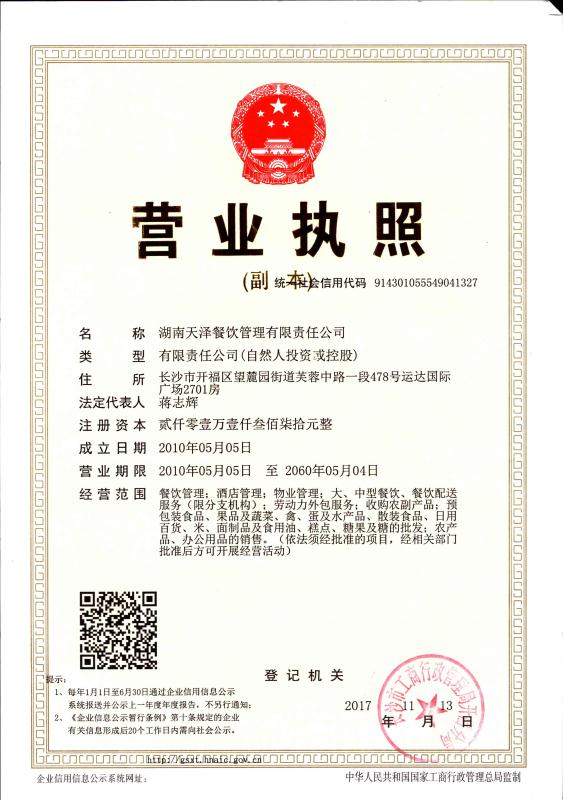 湖南天泽餐饮管理有限责任公司(简称天泽公司)于2010年在长沙市成立,后转入开福区,注册资金为10010000元,是一家专业承包团体膳食服务的企业。